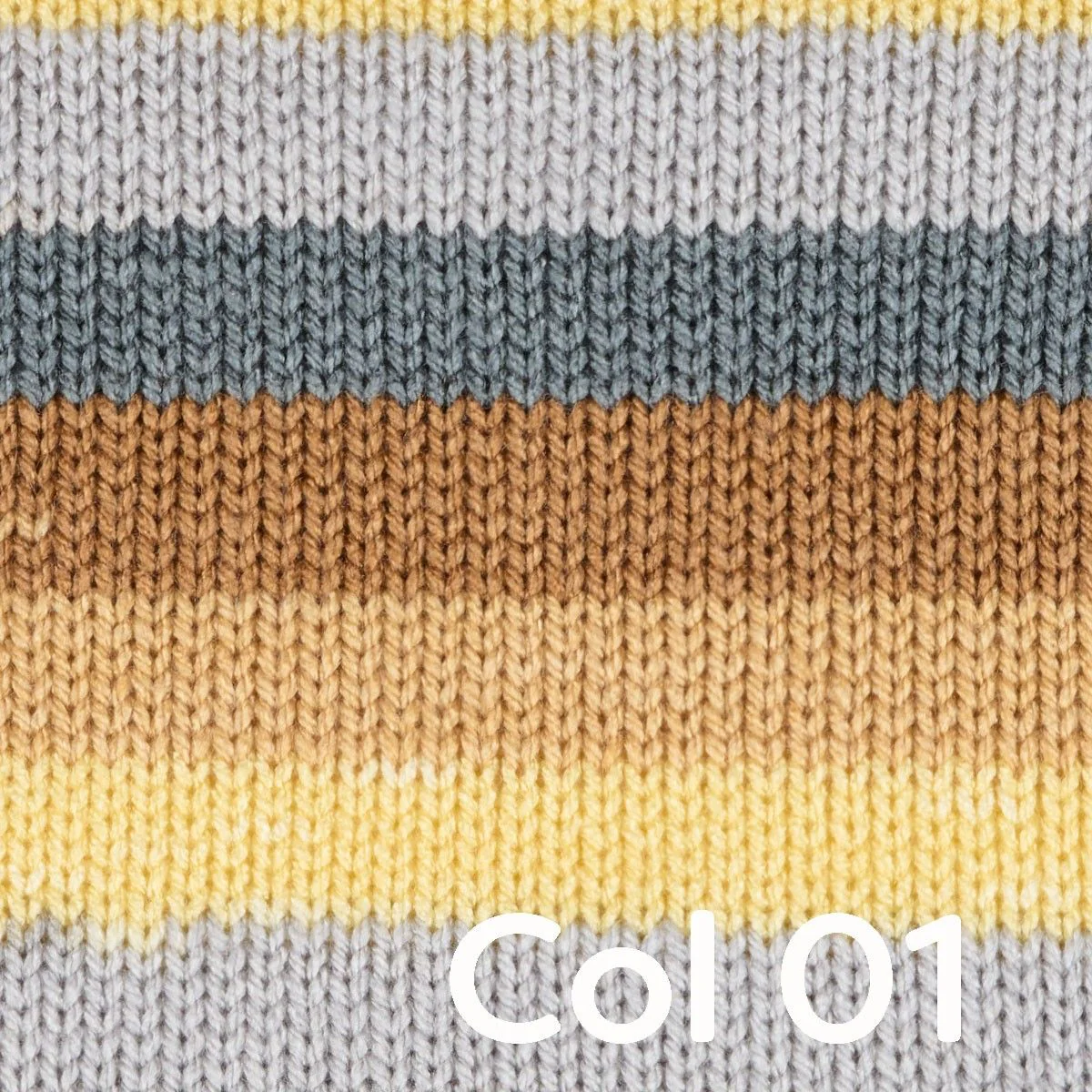The long color changes result in mainly bright, vibrant, and joyful stripes, as well as a few pastel options. The 550-meter-long skeins will get you very far in the progress of your projects making sure that you have fewer knots to hide.