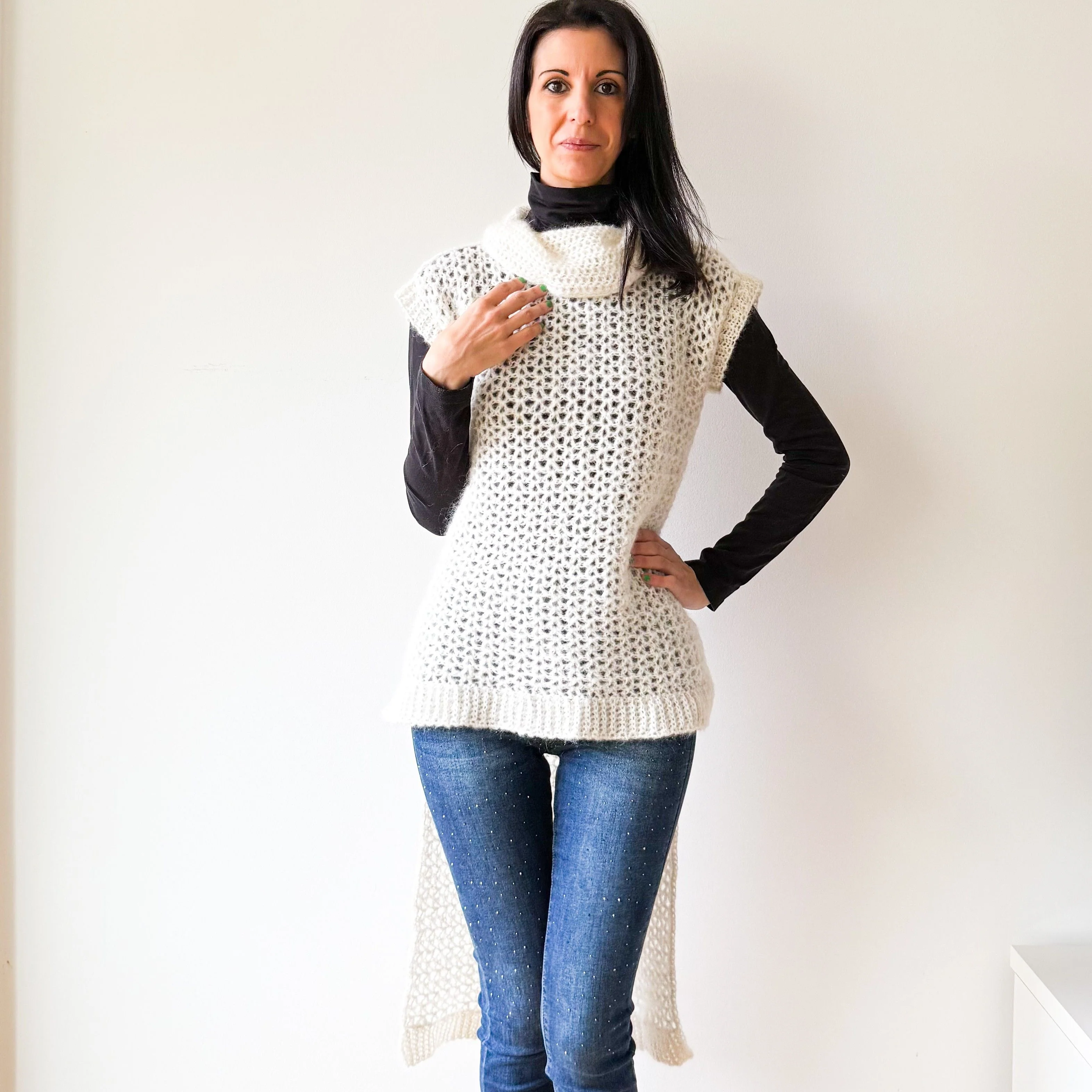 Morena is a sleeveless jumper with a soft, relaxed turtleneck - shorter in the front and longer in the back for a gentle, flowing shape. Worked entirely with a crochet hook, this beginner-friendly piece is made in two simple panels with no sewing required. The stitch pattern repeats in steady, textured rows, making it both quick and satisfying to create. Versatile and comfortable, it pairs effortlessly with an office shirt and trousers, layered over a turtleneck for casual days, or worn lightly over a vest in spring or autumn.